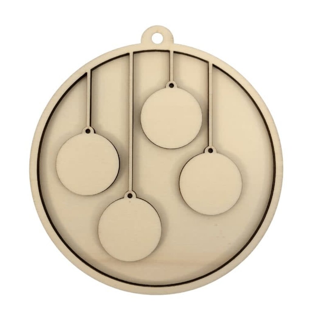- 1 uitgesneden kerstbal met 4 kleinere ornamenten en ophangoogje