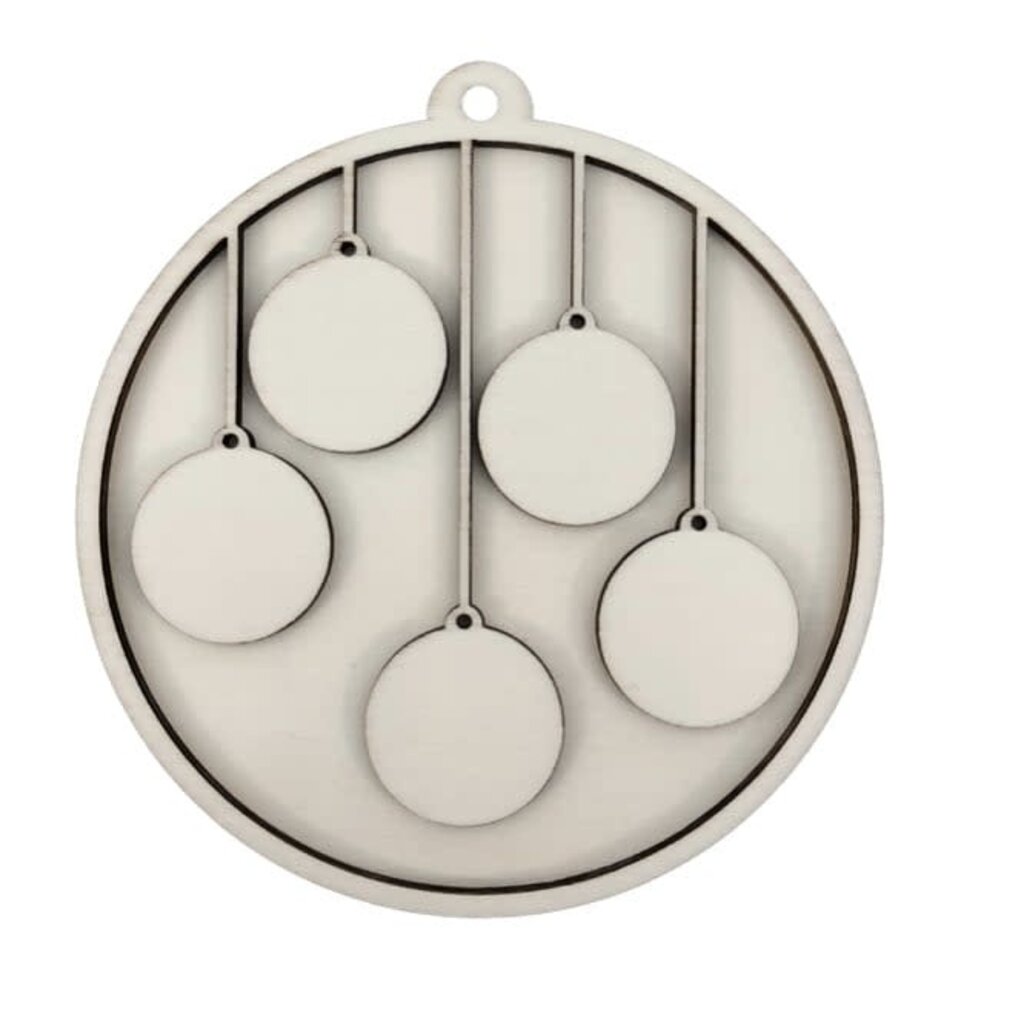 - 1 uitgesneden kerstbal met 5 kleinere ornamenten en ophangoogje