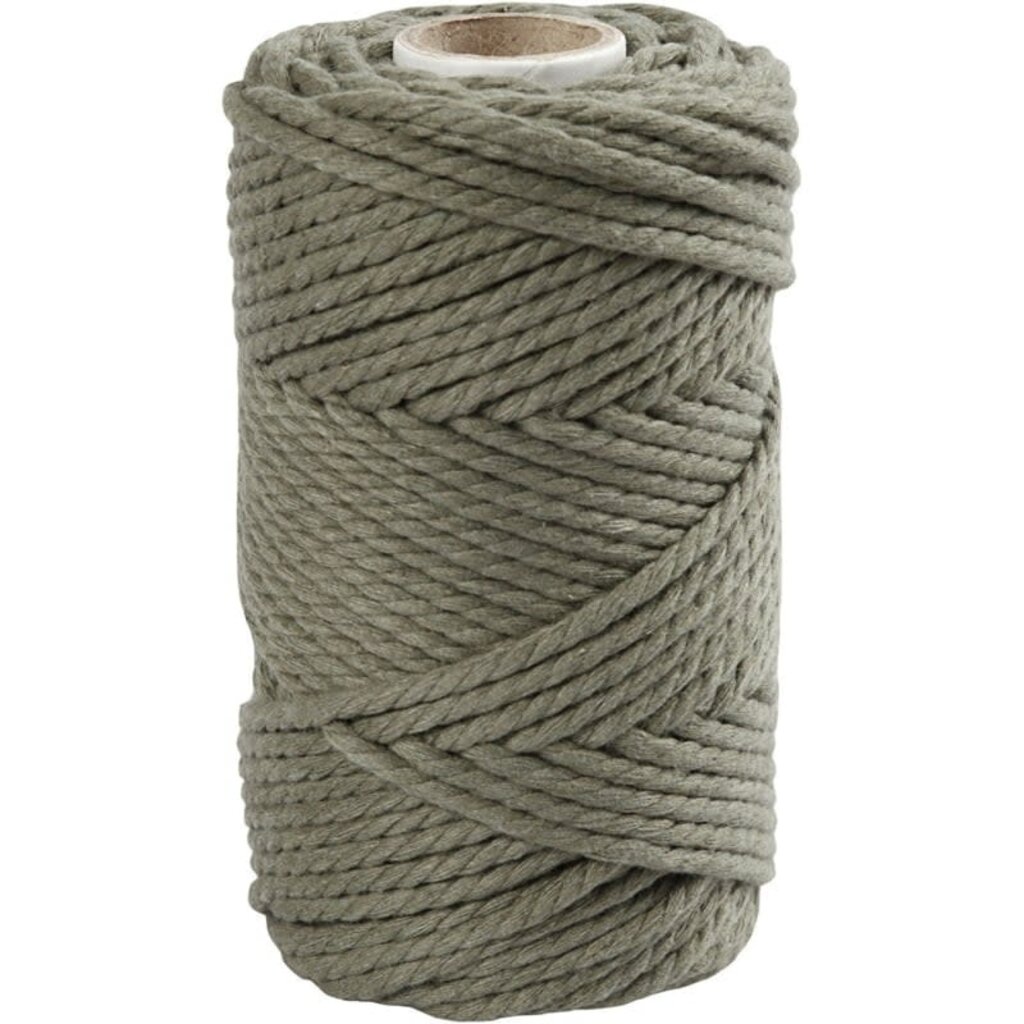 Drievoudig/3-draads macramégaren gemaakt van 80% gerecycled katoen en 20% polyester. Dit sterke macramé koord is ideaal voor het knopen van grotere projecten zoals wandkleden, hangende bloemenmanden, net-draagtassen etc.