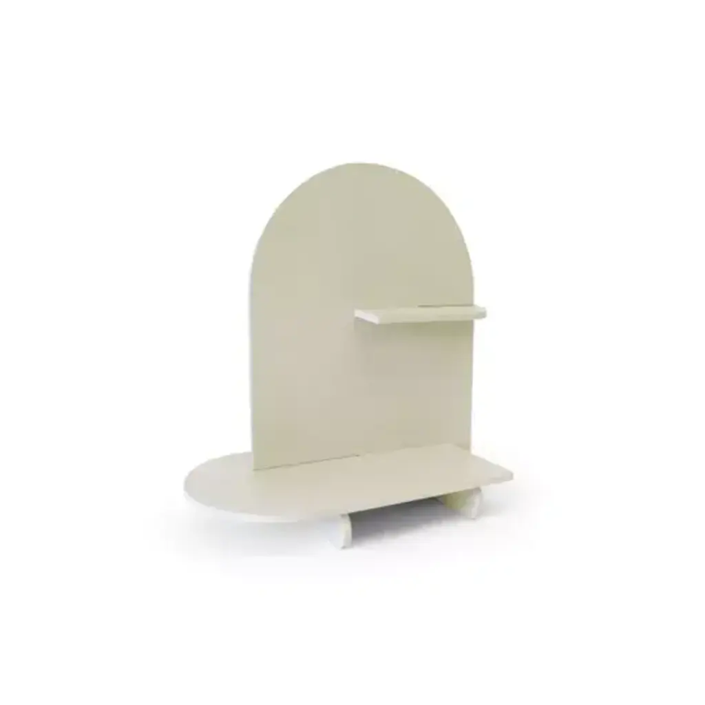 Dit boogrekje in zachte tint is zo’n item dat meteen warmte brengt in een ruimte. De afgeronde vorm geeft een speelse touch, terwijl de drie plankjes zorgen voor praktische opbergruimte. Mooi én handig, dus.