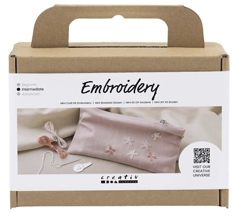 Inhoud: Clutch-tas, borduurgaren, naald, naalddoorsteker.