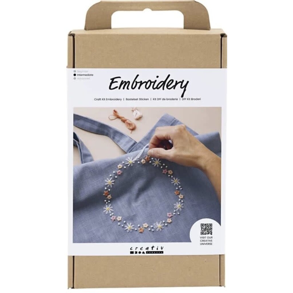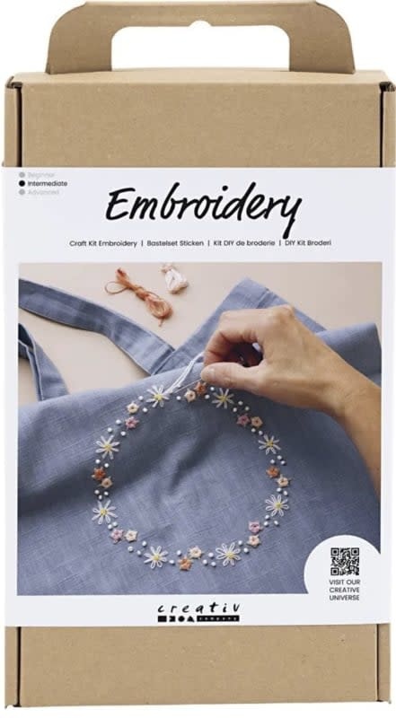 Als u een draagtas wilt borduren, is dit de perfecte set voor u. De set bevat alles wat u nodig hebt om aan de slag te gaan. De krans is geborduurd met mille fleursteek, geweven rozen, Franse knopen en kraaltjes. Er staan instructies op de achterkant van de doos, maar u kunt ook de QR-code scannen en de online-instructies volgen.