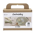 Inhoud: Borduurframe, stof, borduurgaren, naald, naalddoorsteker.
