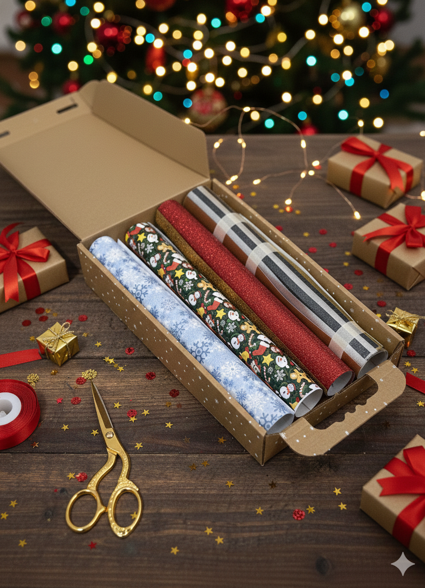 In de stevige kartonnen doos vind je een zorgvuldig gekozen mix van kerstprints en glitterlooks. Perfect om last-minute cadeaus te personaliseren, labels te maken of die foute kersttrui te maken.