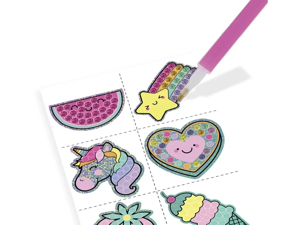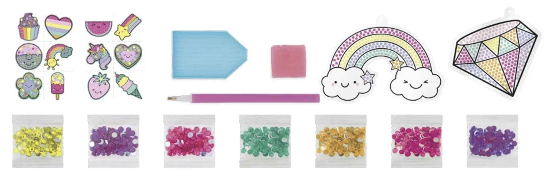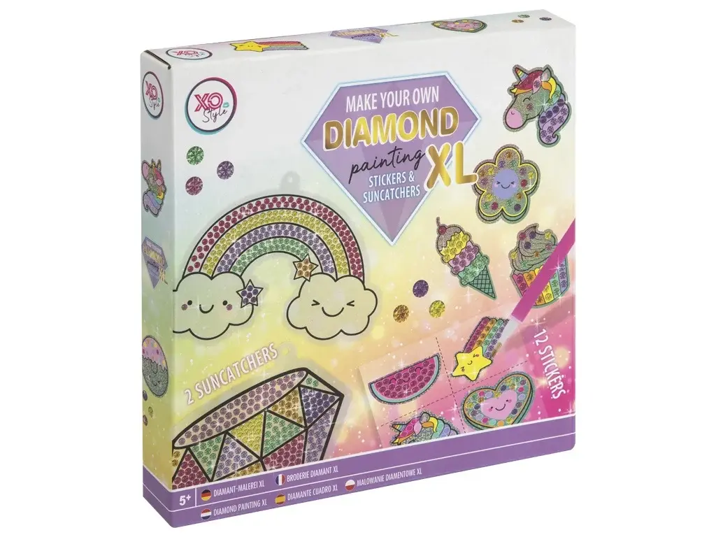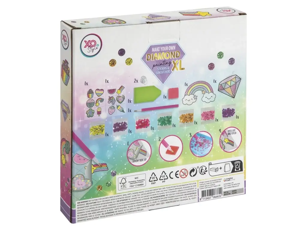De Diamond Painting XL-set bevat 12 stickers en 2 suncatchers in hetzelfde thema. Het is een leuke en creatieve activiteit om te genieten van het maken van kunst en het versieren van je omgeving met schattige regenboog en fantasie ontwerpen.