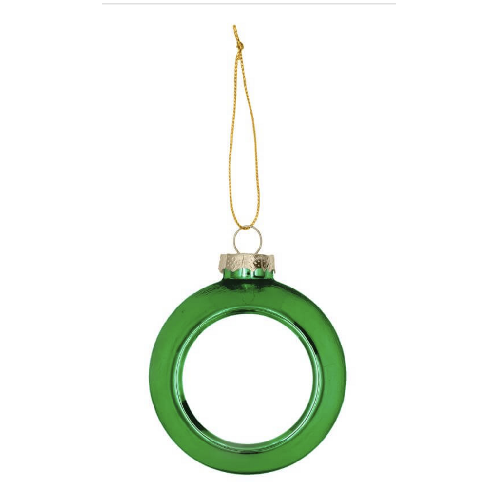 Deze kerstbal is gemaakt van groen plastic. Aan een kant heeft de bal een vlak inzetplaatje dat je kunt bedrukken door sublimatie. De kerstbal heeft een doorsnede van 80 mm, en het inzetplaatje een doorsnede van 50 mm.