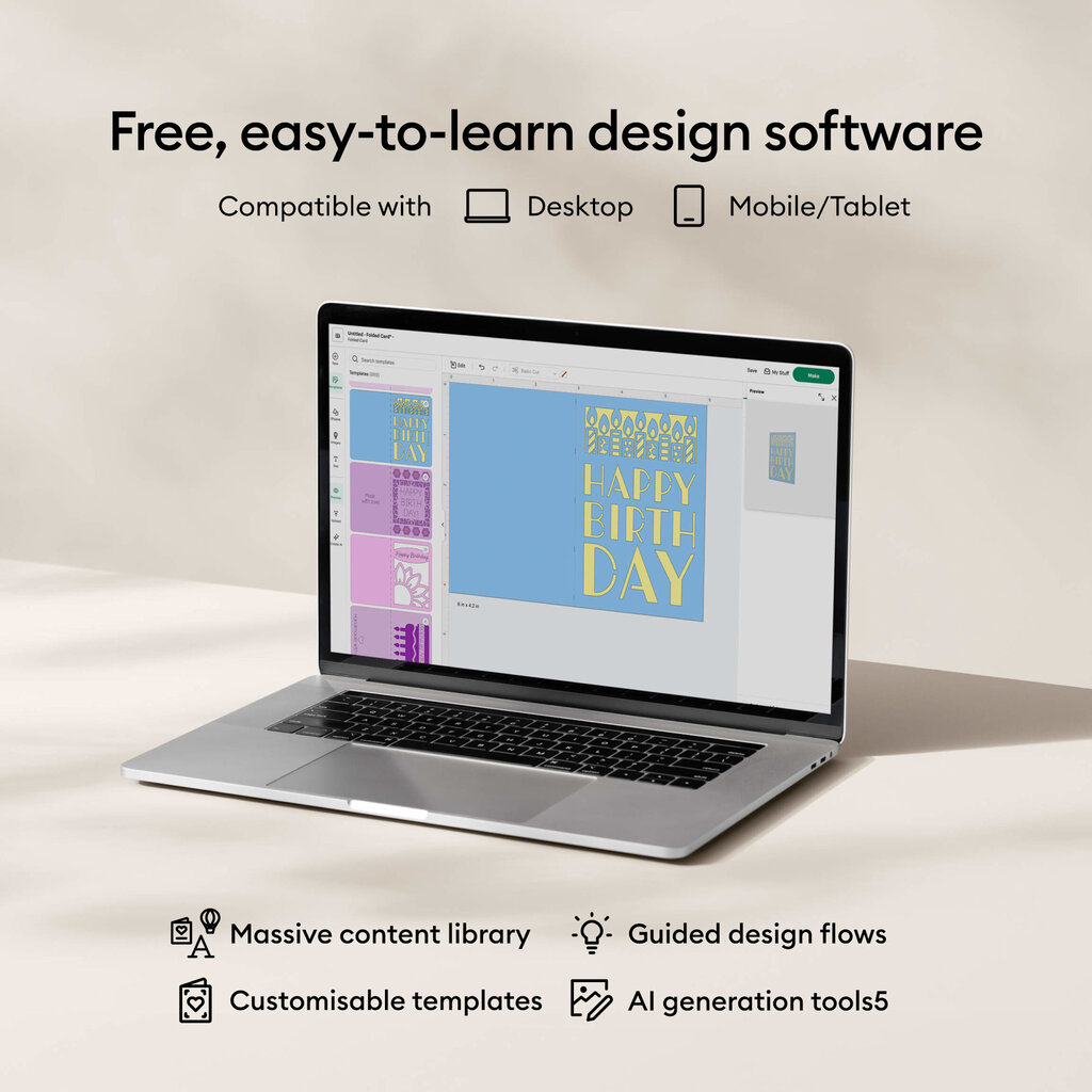 Via Bluetooth verbind je met de gebruiksvriendelijke Design Space app op je smartphone of computer. Daar vind je duizenden gratis ontwerpen, lettertypes en kant-en-klare projecten. Je krijgt ook een gratis proefabonnement om extra inspiratie te ontdekken.