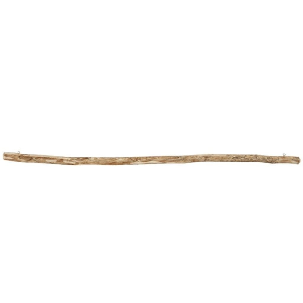 Ronde houten stok met bast uitgerust met 2 kleine metalen ogen (diameter binnenkant 3 mm) voor het ophangen van wanddecoratie uit macramé.