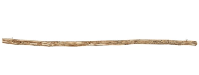 Ronde houten stok met bast uitgerust met 2 kleine metalen ogen (diameter binnenkant 3 mm) voor het ophangen van wanddecoratie uit macramé.