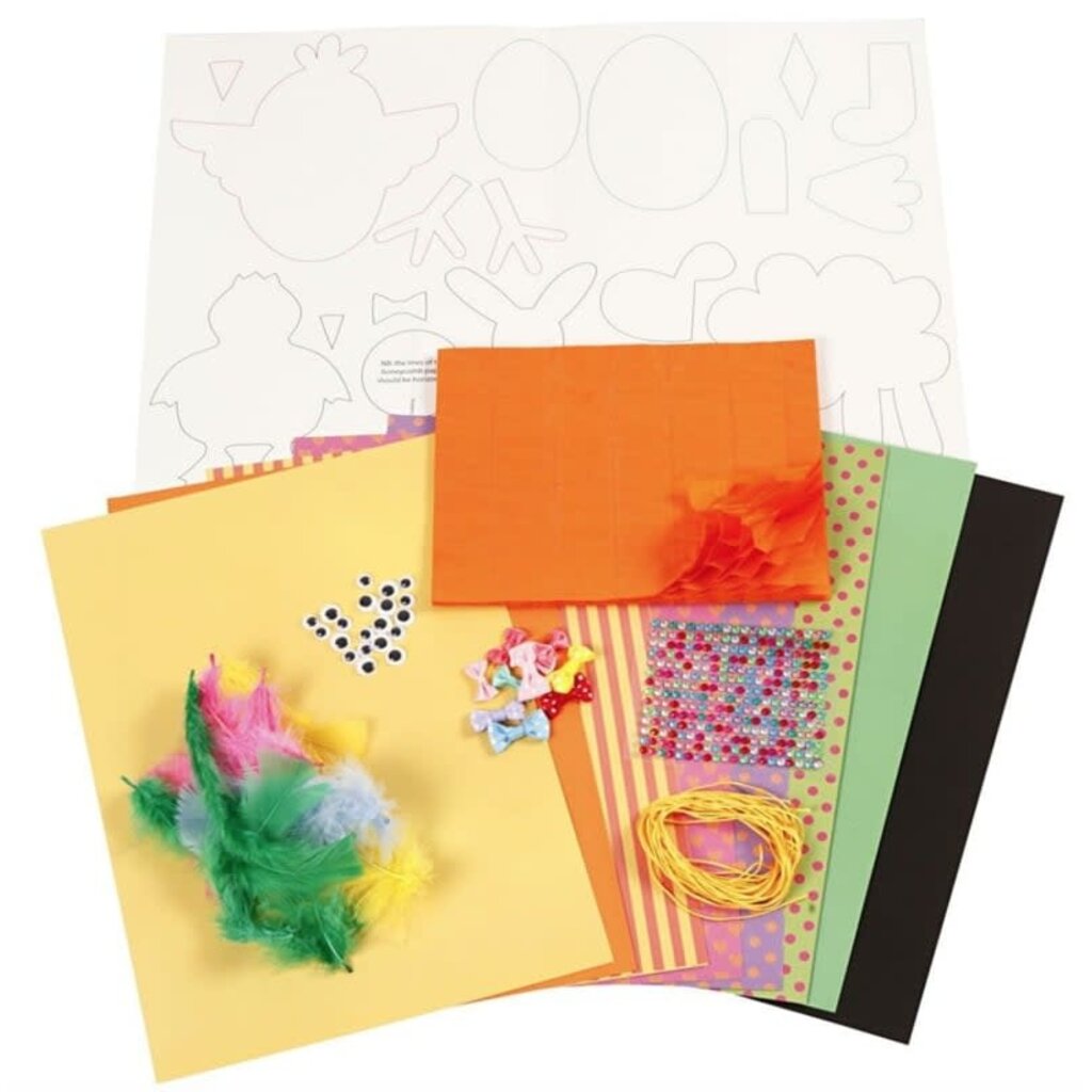 Inhoud: 4 vellen gewoon A4 karton, 1 vel gewoon A5 karton, 4 vellen bedrukt A4 karton, 1 vel honingraat papier, wiebelogen, zelfklevende strasstenen, koord en veren in verschillende kleuren.