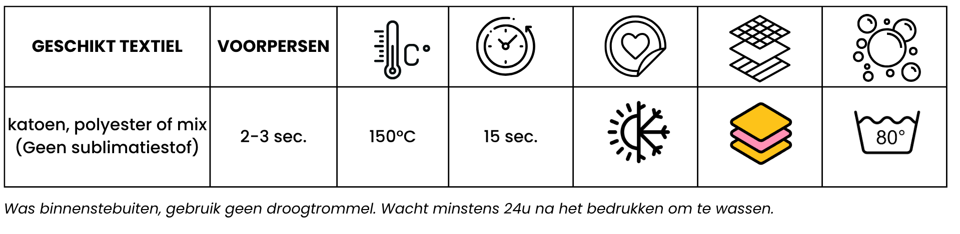 Was binnenstebuiten, gebruik geen droogtrommel. Wacht minstens 24u na het bedrukken om te wassen.