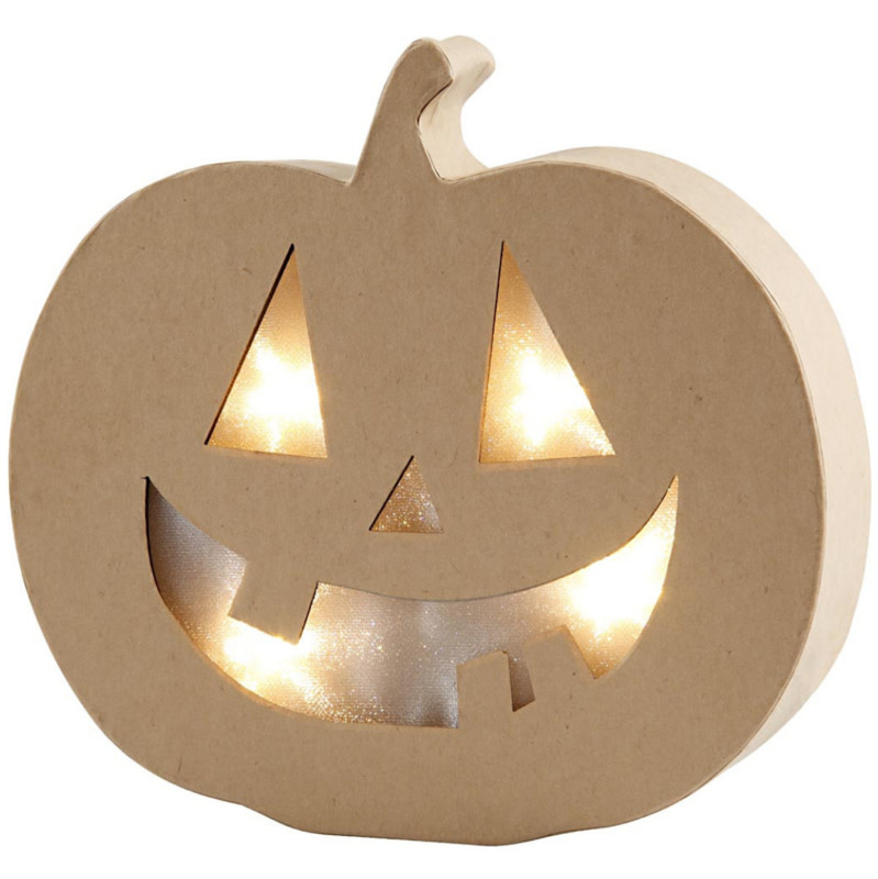 Platte papier-maché pompoen met vrolijk gezicht en warm LED-licht. Kan zelfstandig staan, heeft een ingebouwd batterijvak en een aan/uit schakelaar aan de zijkant. Het licht schijnt sfeervol door de uitgesneden openingen.