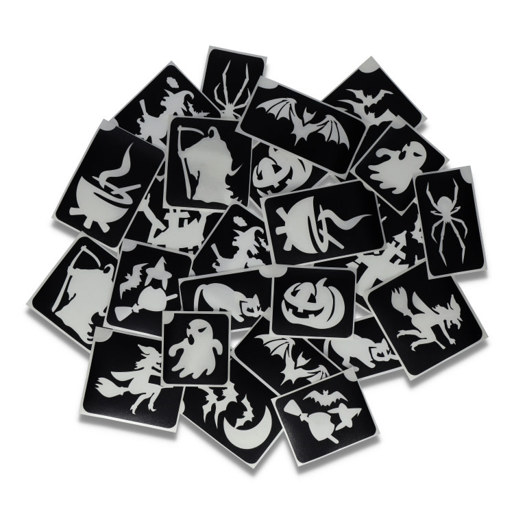 Inhoud: 12 x 2 Halloween-thema glittertattoo sjablonen (24 stuks) en een duidelijke instructiekaart.
