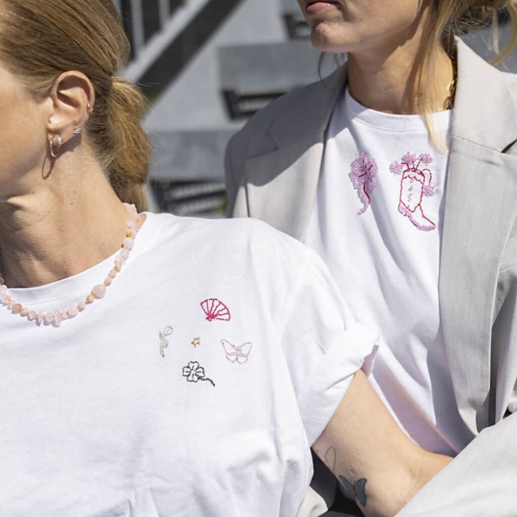 Wanneer het borduurwerk klaar is, doopt u de stof in water zodat de stickers oplossen. Na het strijken is het ontwerp klaar om te dragen. Zo ontstaat een persoonlijk kledingstuk met karakter, zonder ingewikkelde technieken.