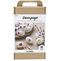 Inhoud: plastic eieren, gedroogde en geperste bloemen, decoupage lijmlak, penseel, hanger en touwtje.
