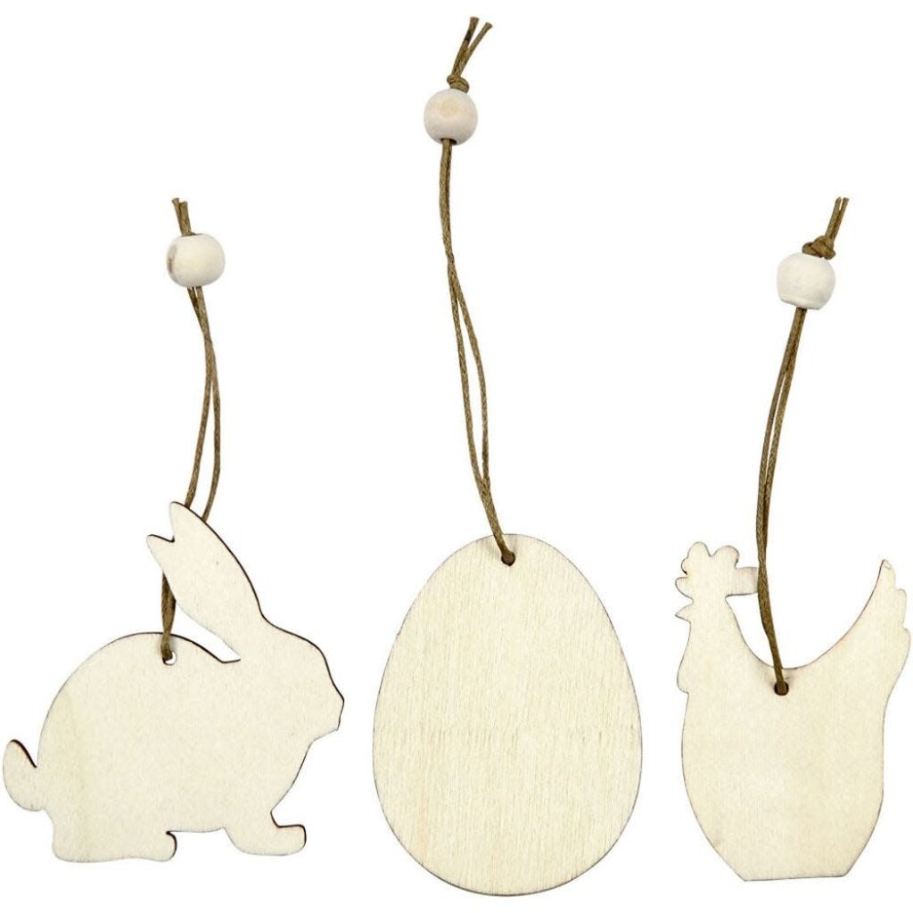 Decoraties van licht hout met ophanglus van jute en een houten kraal.