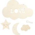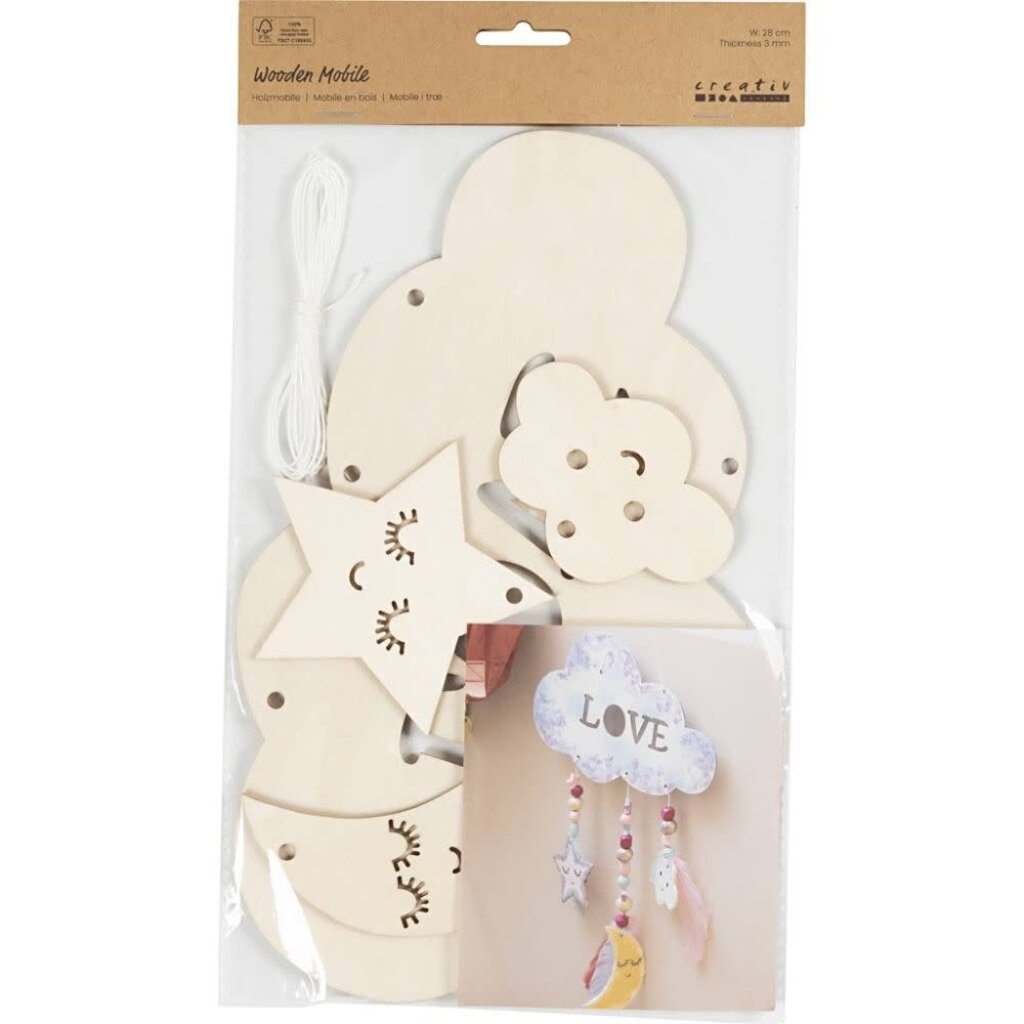 Met deze houten mobiel maak je zelf een dromerige decoratie voor de kinderkamer. De wolk is voorzien van voorgeboorde gaten om drie touwtjes aan te bevestigen, waaraan de bijpassende houten ornamenten hangen: een ster, een maan en een wolkje. Zo stel je eenvoudig je eigen mobiel samen, helemaal in jouw stijl.