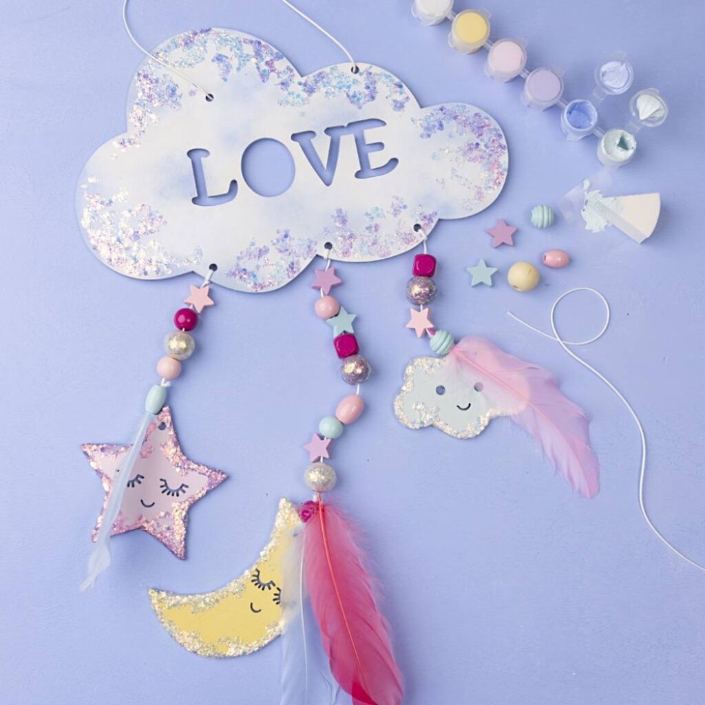 Versier de onderdelen met verf, glitter clay en veren voor een speels of zacht effect. Rijg kralen in kleuren die passen bij het interieur voor een mooi, harmonieus geheel. Of je nu kiest voor rustige pasteltinten of een vrolijke mix van kleuren, deze mobiel wordt sowieso een persoonlijk pronkstuk.