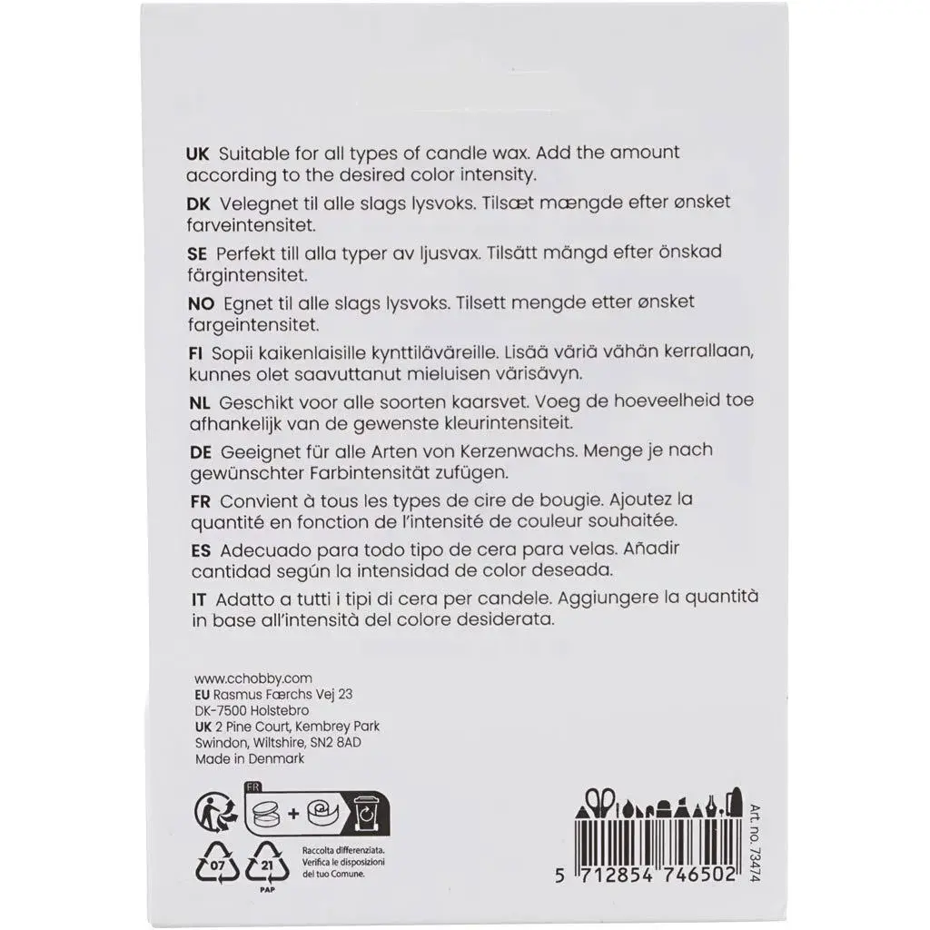 Met deze kaarsenverf maakt u uw eigen unieke kaarsen in mooie kleuren. Geschikt voor sojawas, paraffine en andere kaarswas.