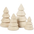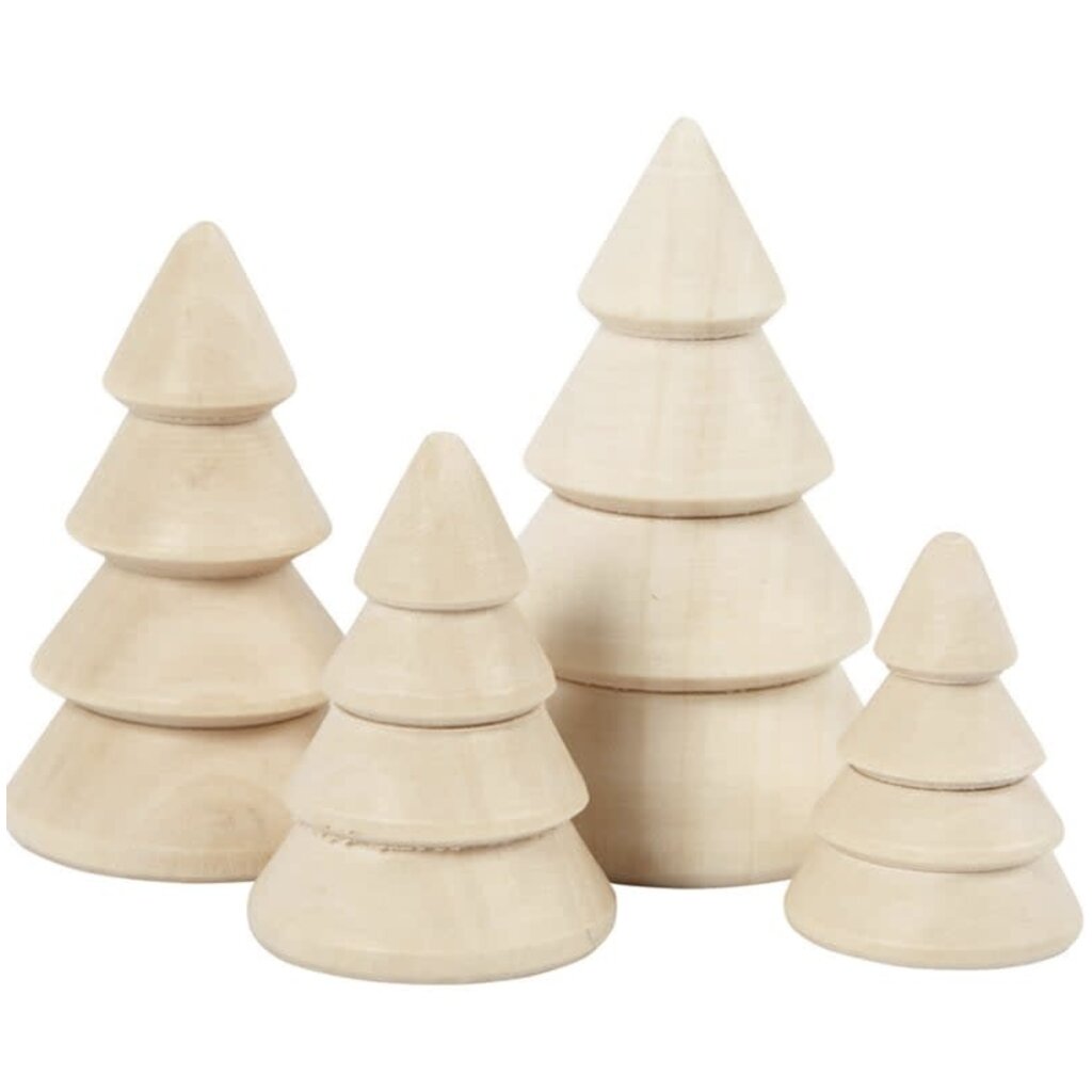 Vier charmante kerstboompjes, elk gemaakt van ronde kegels in massief hout. Hun eenvoudige vorm en natuurlijke uitstraling maken ze ideaal voor zowel minimalistische als creatieve kerstdecoraties.