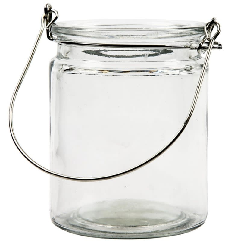 Cylindervormig glas met hengsel van transparant glas met metalen hanger.h: 10 cm, d: 7,6 cm
