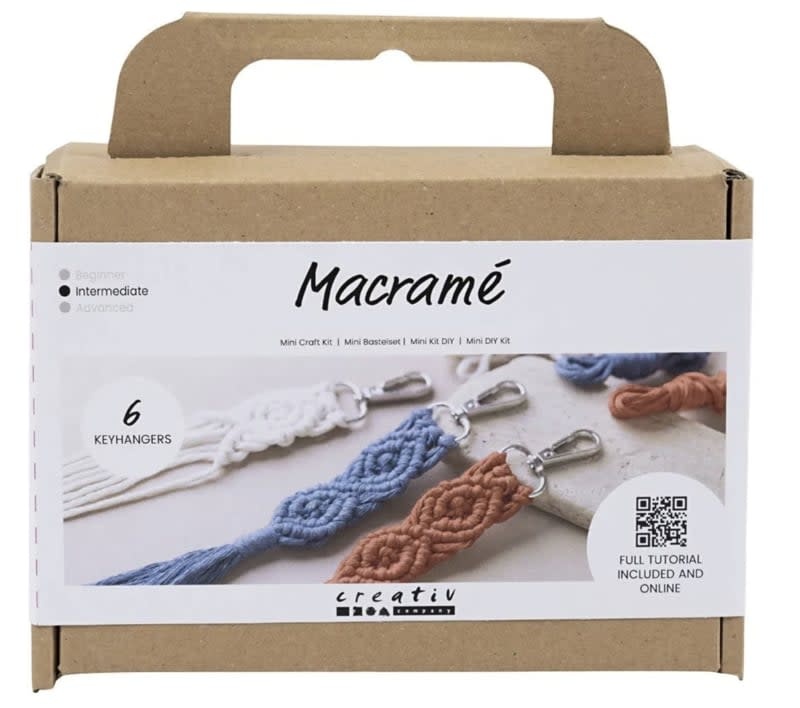Wilt u uw eigen sleutelhanger knopen met macramé, dan is deze set iets voor u. De set bevat alles wat u nodig hebt om aan de slag te gaan. U verdubbelt de vier draden met een opzetlus in de brede ring van de karabijnhaak. Het patroon zelf is gemaakt met een diagonale festonnoop en afgewerkt met een macramé wikkelknoop. Het resultaat is de mooiste sleutelhanger. Er staan instructies op de achterkant van de doos, maar u kunt ook de QR-code scannen en de online-instructies volgen.