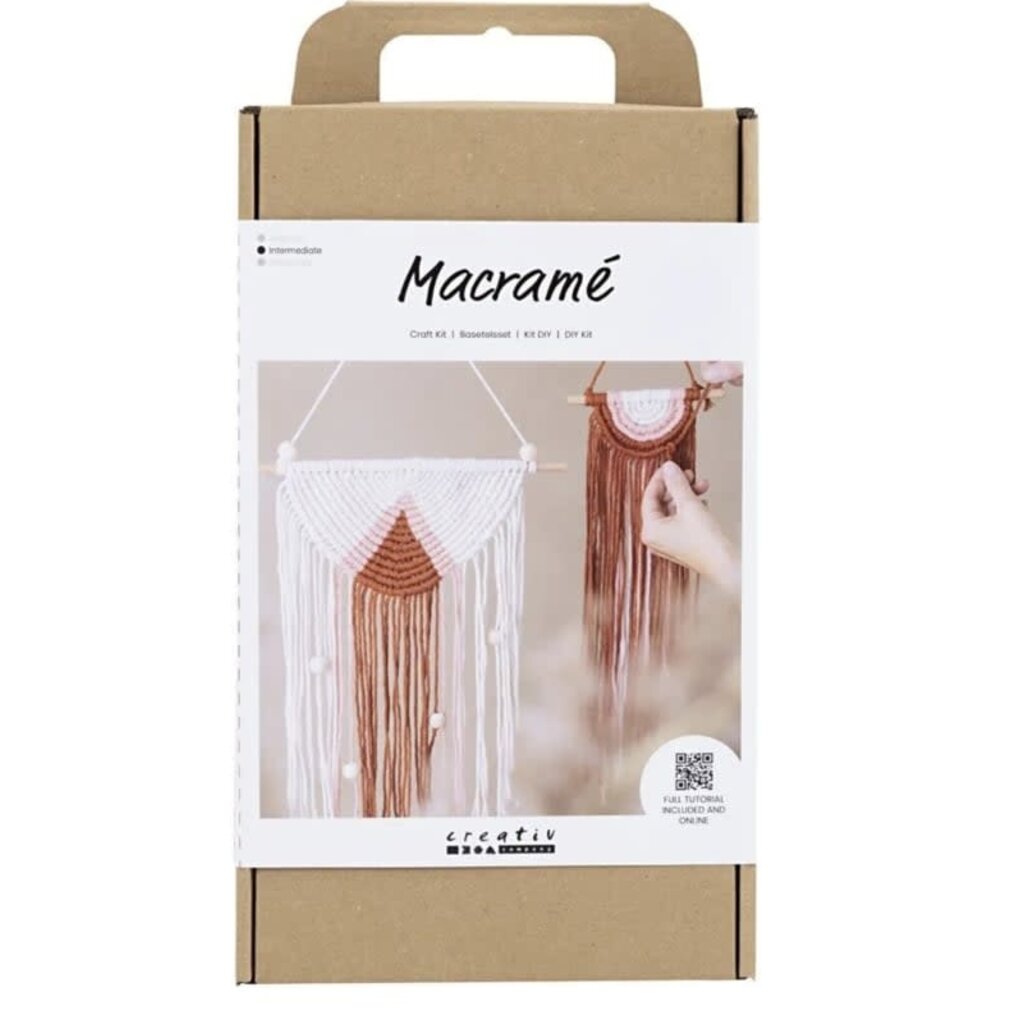 Wilt u leren om een macramé muurdecoratie te knopen, dan is deze set echt iets voor u. De set bevat alles wat u nodig hebt om aan de slag te gaan. Een hangende decoratie gemaakt van geknoopte halve cirkels op een houten stok. Wikkel eerst de strengen macramédraad rond de stok met een opzetlus. Maak daarna de halve cirkel met een diagonale dubbele festonknoop. Als resultaat hebt u prachtige ophangdecoraties voor de muren in uw huis. Er staan instructies op de achterkant van de doos, maar u kunt ook de QR-code scannen en de online-instructies volgen.