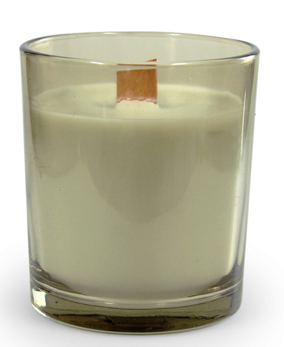 Plantaardige kaars met 50% parfum, kaars in gekleurd glas met houten wiek.
