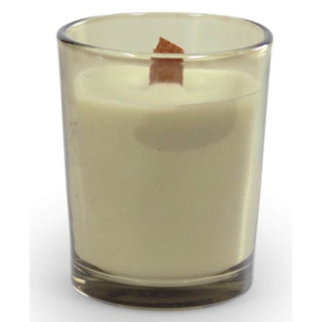 Plantaardige kaars met 50% parfum, kaars in gekleurd glas met houten wiek.