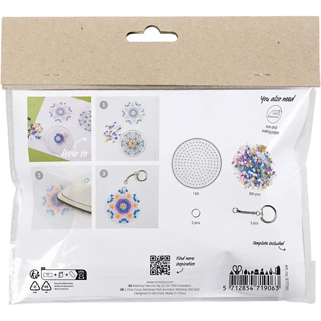 Inhoud: Onderplaat, strijkkralen, sleutelhanger met ketting, sleutelhangers.