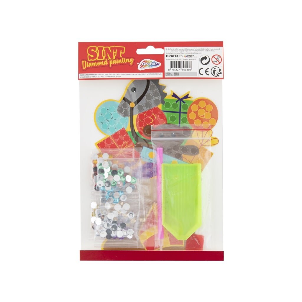 Met deze creatieve set voeg je glinsterende steentjes toe aan een groot canvas en vorm je zo een prachtig Sinterklaasbeeld.