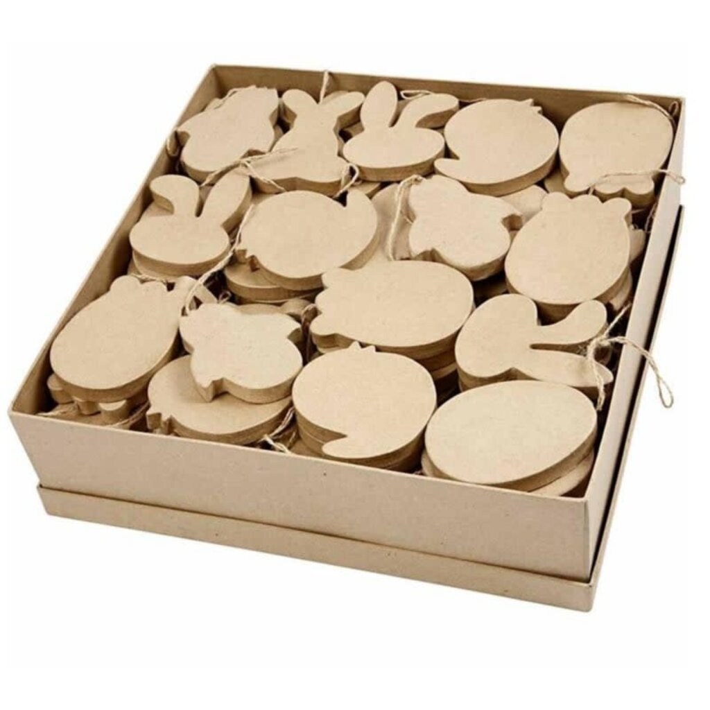 Paas ornamenten van papier-maché met jute ophangkoord.