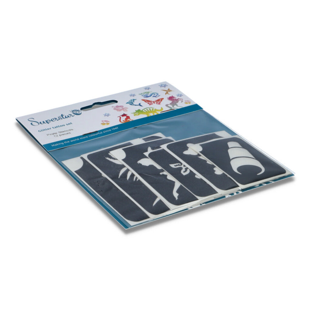 Inhoud: 6 x 2 piraat thema glittertattoo sjablonen en een duidelijke instructiekaart.