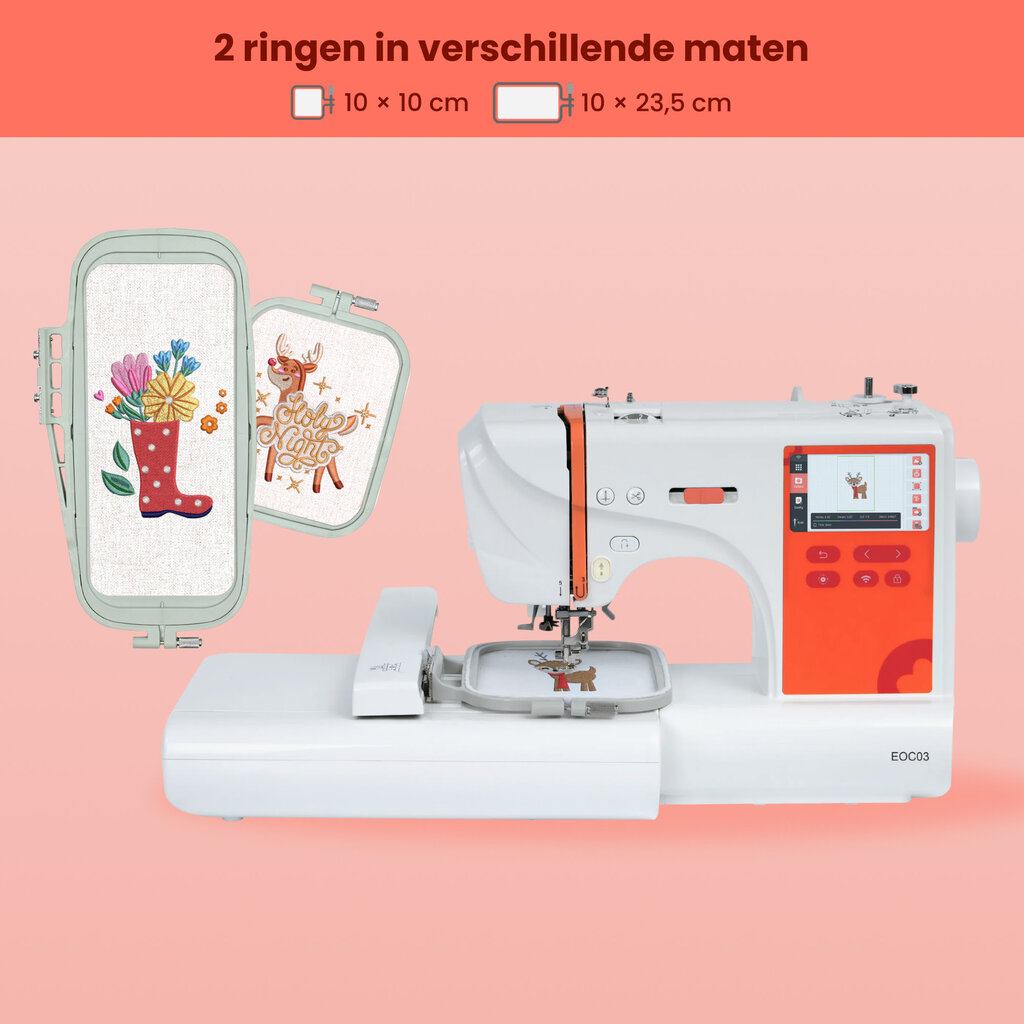De EOC03 borduurmachine maakt borduren eenvoudig én toegankelijk. Met een werkgebied tot 10x23,5 cm en een intuïtieve touchscreen werk je vlot aan elk ontwerp. Automatische functies nemen het technische werk uit handen, terwijl je via WiFi of USB moeiteloos je eigen designs inlaadt.