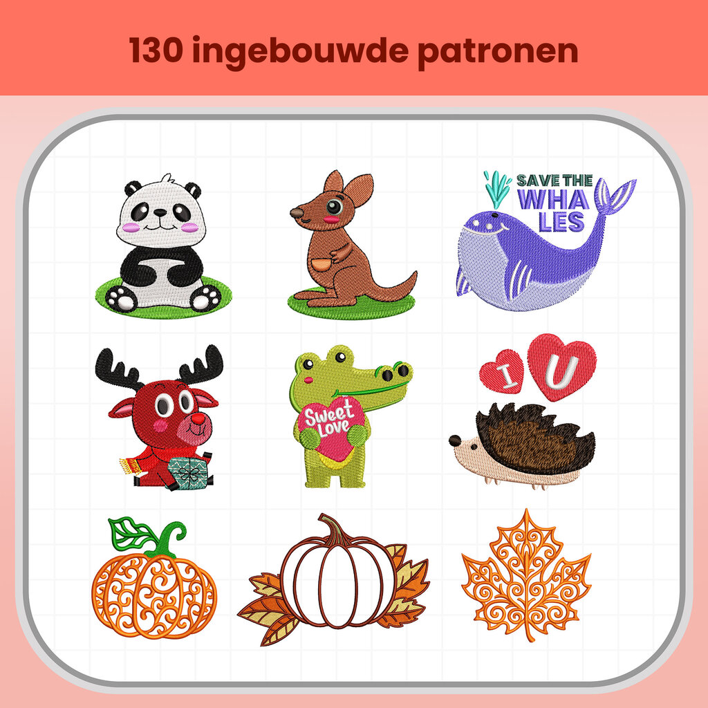 Kies uit 130 ingebouwde patronen, 24 randdesigns en 8 lettertypes. Ideaal om meteen te starten, te oefenen of snel iets moois te personaliseren zonder extra voorbereiding.