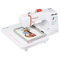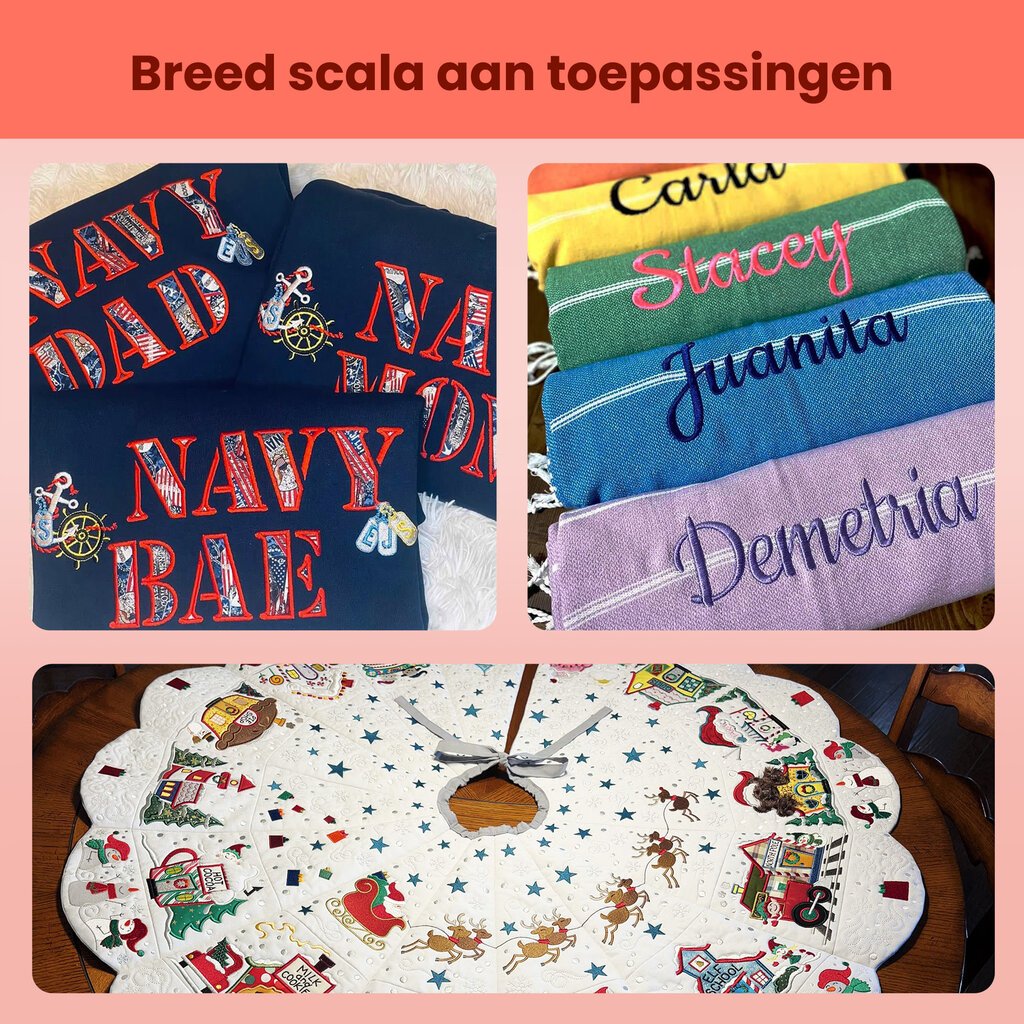 Met vier verwisselbare borduurringen werk je flexibel aan elk formaat, van kleine logo’s tot grote ontwerpen. Het ruime werkgebied en de extra werkplaat maken ook grotere projecten verrassend makkelijk.
