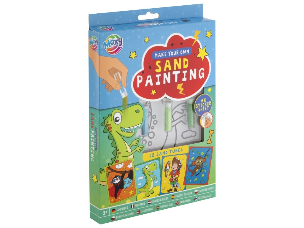 Deze set bevat 4 vellen met verschillende ontwerpen daarnaast bevat de set 12 tubes met verschillende kleuren zand, waarmee je de patronen kunt vullen en zo kleurrijke en textuurrijke kunstwerken kunt creëren.