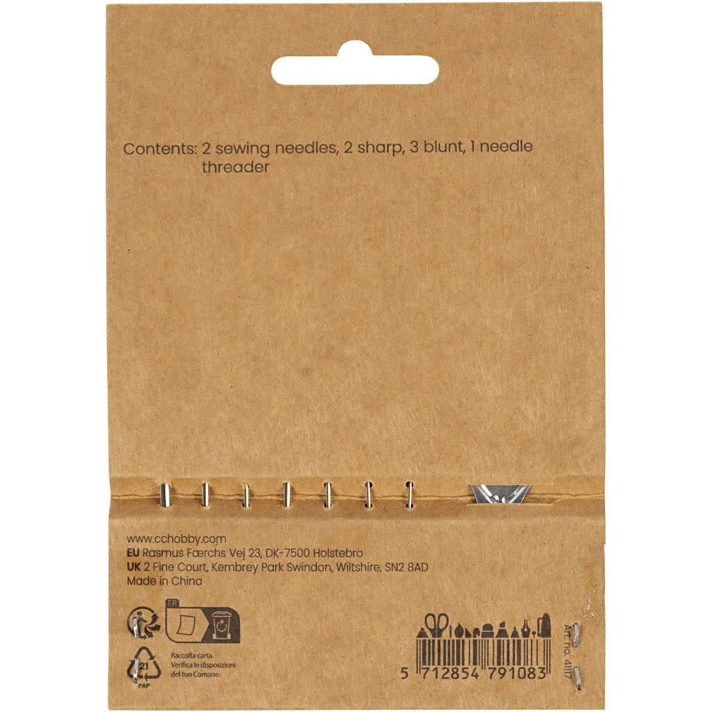 Inhoud: 2 naainaalden, 2 met scherpe punt, 3 zonder scherpe punt, 1 naaldvoerder.