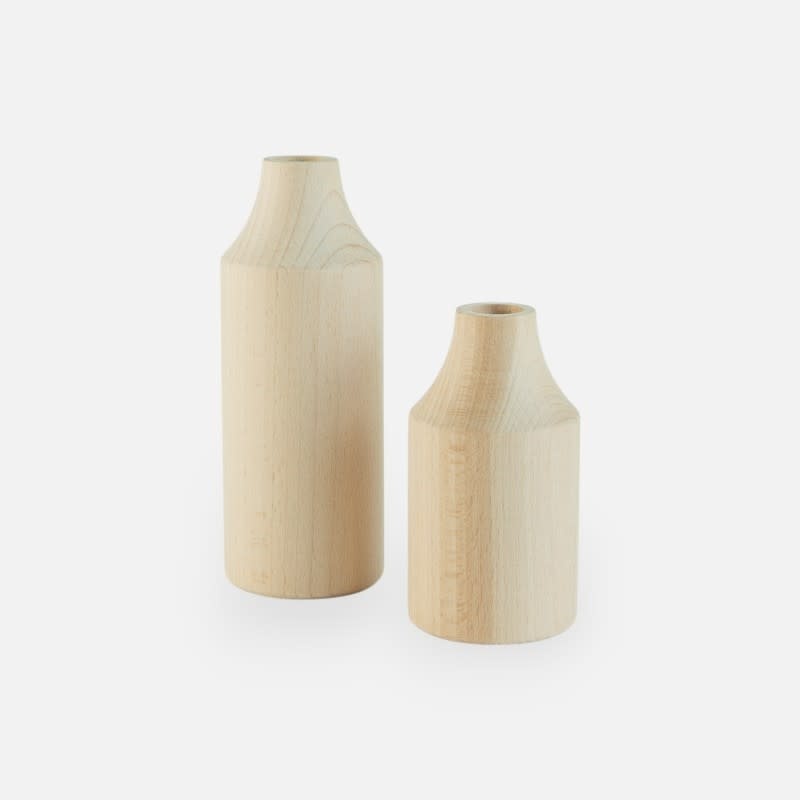 Deze set van twee houten vaasjes straalt eenvoud en warmte uit. Met hun strakke, minimalistische vorm passen ze in elk interieur – van modern tot boho.
