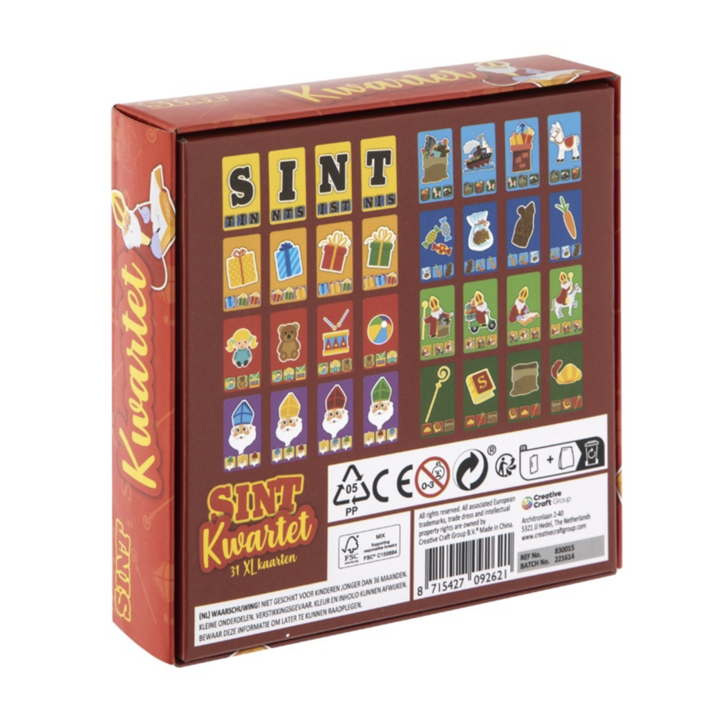 Beleef eindeloos speelplezier met het Sint Kwartet – het leukste kaartspel voor de feestdagen! Verzamel kwartetten van Sinterklaas, de Pieten, cadeautjes, chocoladeletters, en andere typische Sinterklaas-elementen.