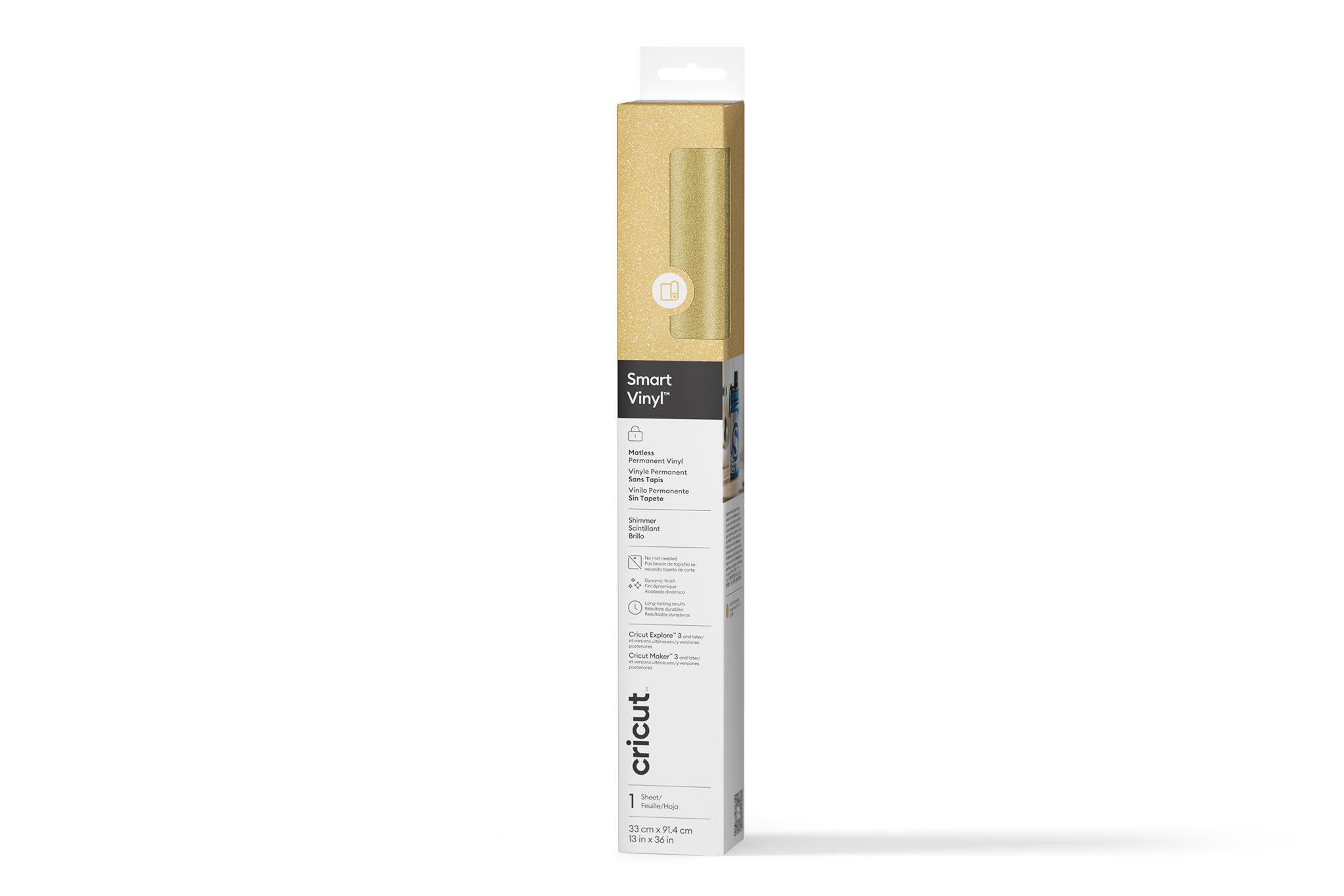 Laat je projecten schitteren met Cricut Smart Vinyl Permanent – Shimmer Gold (33 × 91 cm). Dit glinsterende, goudkleurige vinyl geeft je creaties een luxueuze, sprankelende afwerking. Dankzij de Smart Vinyl-technologie kun je het materiaal gebruiken zonder snijmat – gewoon laden, snijden en aanbrengen.