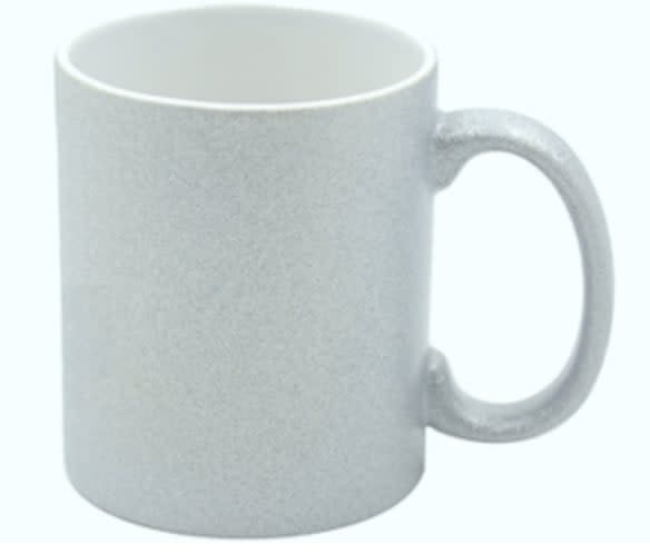 Dye-sub mok met een glanzend oppervlak met glittereffect, verkrijgbaar in zilver, goud of roze. De binnenkant van de Subli-Print keramische mok glittert wit.