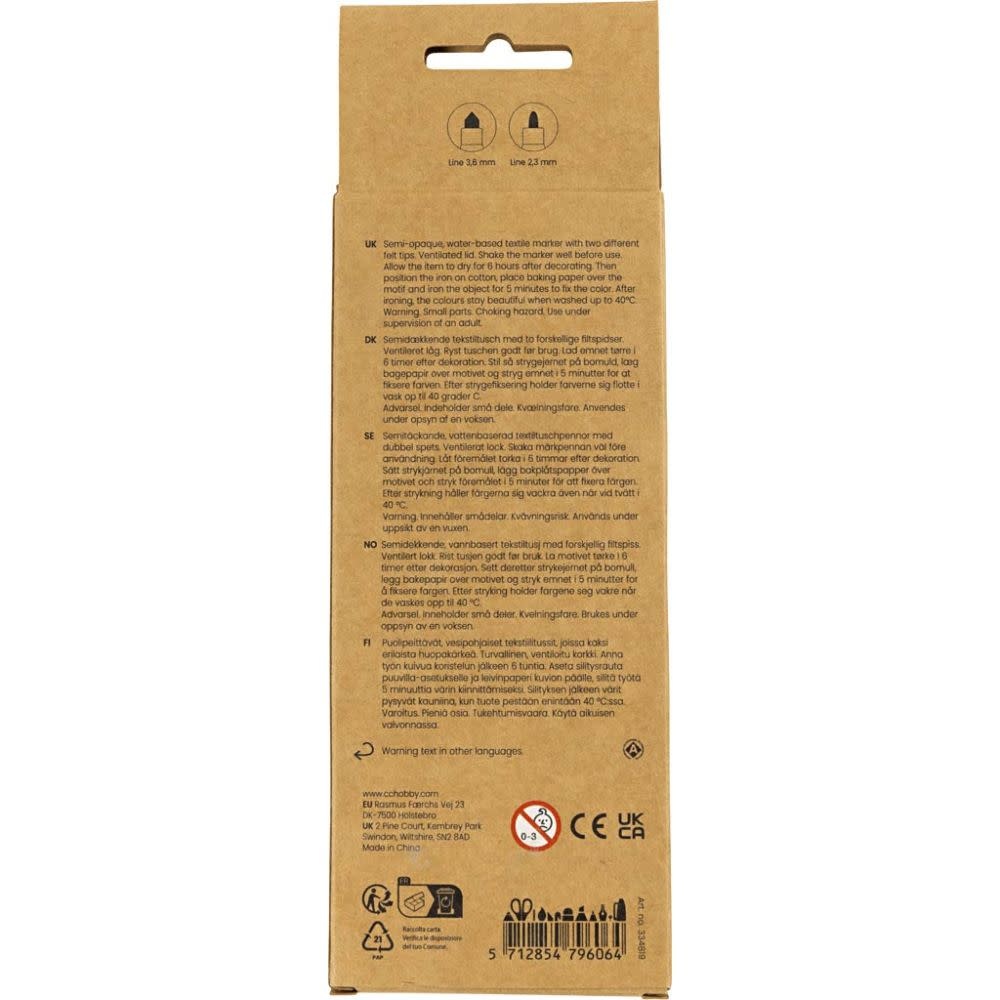 Schud de markeerstift voor gebruik goed en leg plastic of karton in het te beschilderen voorwerp (T-shirt of draagtas), zodat de kleur niet doordringt en doorsijpelt naar de achterkant . Als de verf droog is, kan je bakpapier op de afbeelding leggen en deze vervolgens strijken. Na het strijken blijven de kleuren mooi bij een wasbeurt tot 40 °C. De stift is perfect voor lichte katoenen stoffen enz.